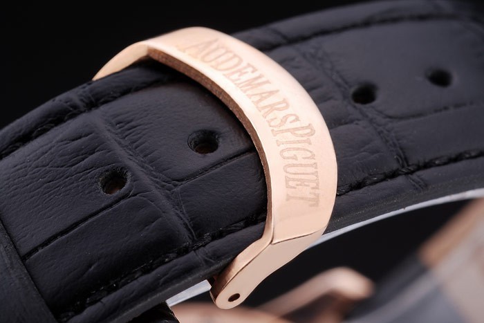 Bracelet de acero inoxidable: correa de piel de cocodrilo Negro con el calor en relieve Audemars Piguet nombre y el logotipo y un Audemars Piguet inscriben rosa de 18 quilates chapado en oro-flip-sobre el gancho clasp