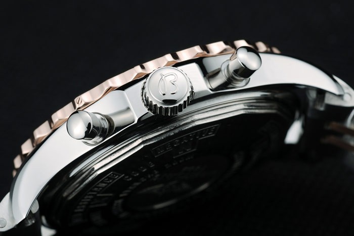 Crown: pulido corona calado de acero inoxidable con el logotipo de Breitling y dos coronas de pulsadores de acero inoxidable más pequeños a cada lado de it