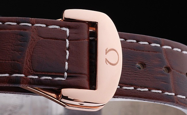 Bracelet oro amarillo: correa de piel de cocodrilo marrón con costuras blancas y el logotipo grabado Omega de oro amarillo de gancho hebilla clasp