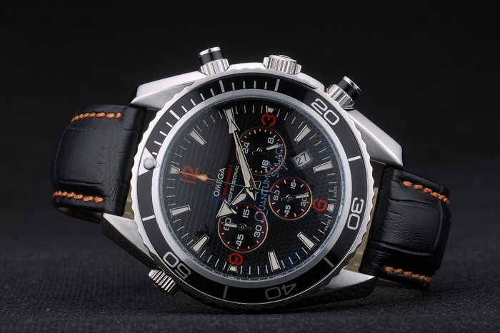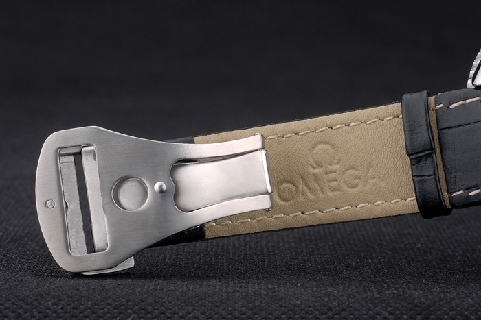 Bracelet de acero inoxidable: correa de cuero negro naranja cosida con relieve de calor sello de Omega y acero inoxidable pulido y plegable broche con el logotipo de Omega en top