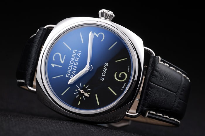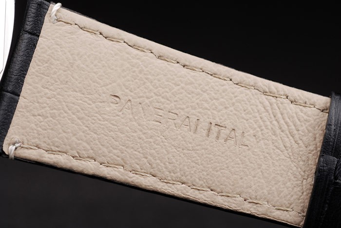 Bracelet de acero inoxidable: correa de piel de cocodrilo Negro con costuras de color blanco y en relieve de calor sello de Officine Panerai Italia y cepillado gancho de acero inoxidable cierre de hebilla con Panerai engraving