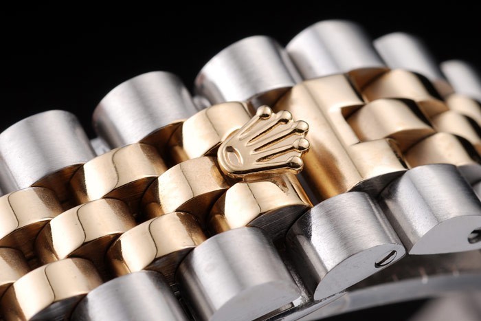 Bracelet de acero inoxidable: Acero Dos brazalete de eslabones de tonos de acero inoxidable cepillado y oro amarillo de 18K plateado con Rolex grabado cierre oculto mostrando la longitud Rolex logo