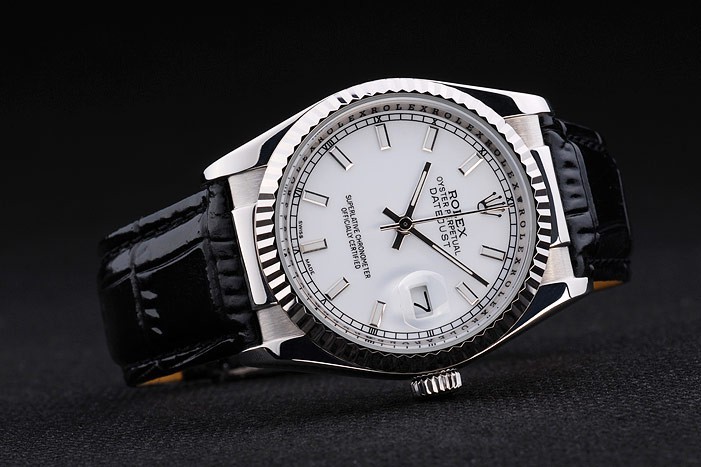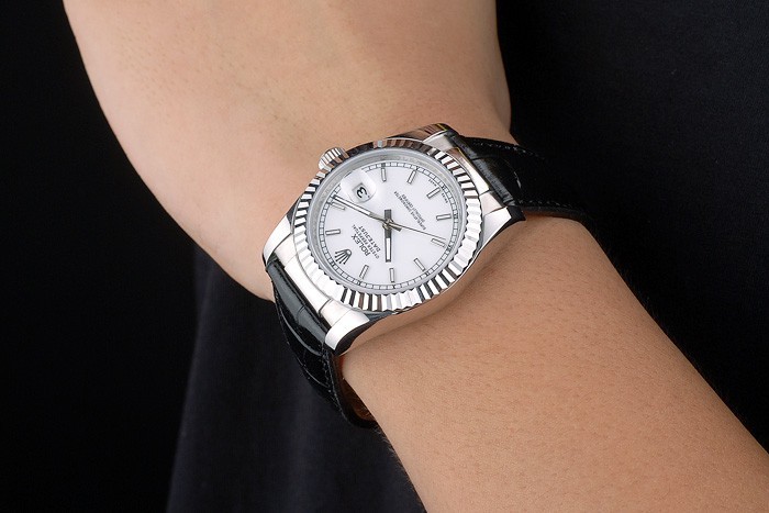 Bracelet acero: correa de piel de cocodrilo Negro con el grabado Rolex doblar por la hebilla de despliegue que muestra el logotipo de Rolex