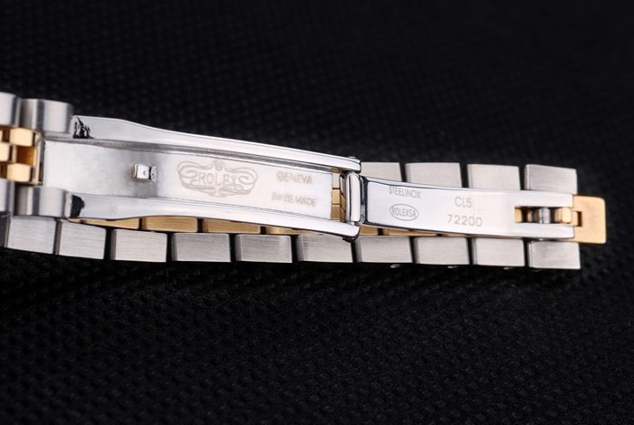 Bracelet de acero inoxidable: Dos brazalete de eslabones de tonos de acero inoxidable cepillado y oro amarillo de 18K chapado en acero con cierre oculto grabado Rolex mostrando la longitud Rolex logo