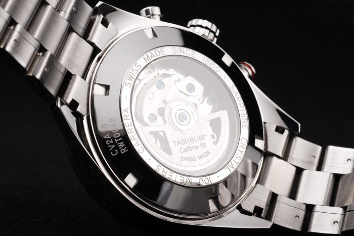 Volver: empuje de acero inoxidable en la parte trasera con la mecánica que revelan transparencia en el centro y Tag Heuer engravings