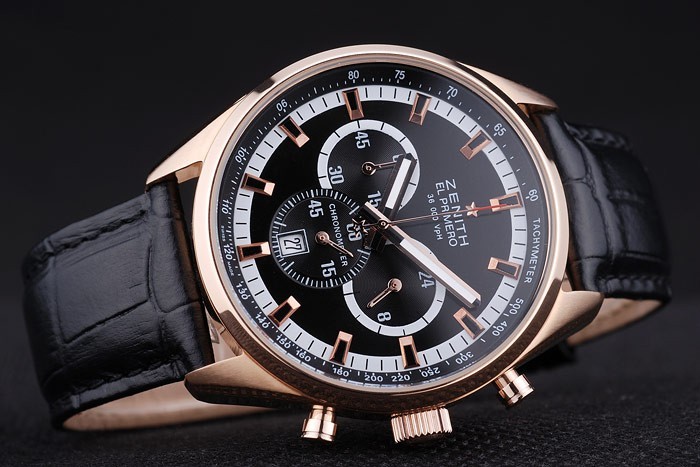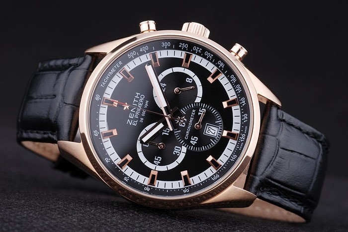 Crown: Rose-chapado en oro de la corona calado con logotipo de la estrella Zenith dos pulsadores coronas circulares más pequeñas a cada lado y grabado de it