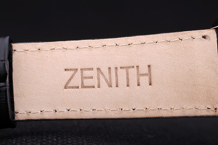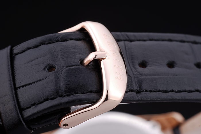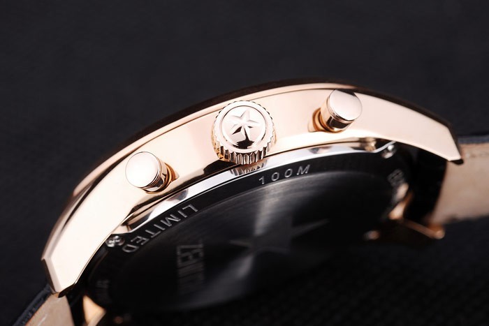 Crown: Rose-chapado en oro de la corona calado con logotipo de la estrella Zenith dos pulsadores coronas circulares más pequeñas a cada lado y grabado de it